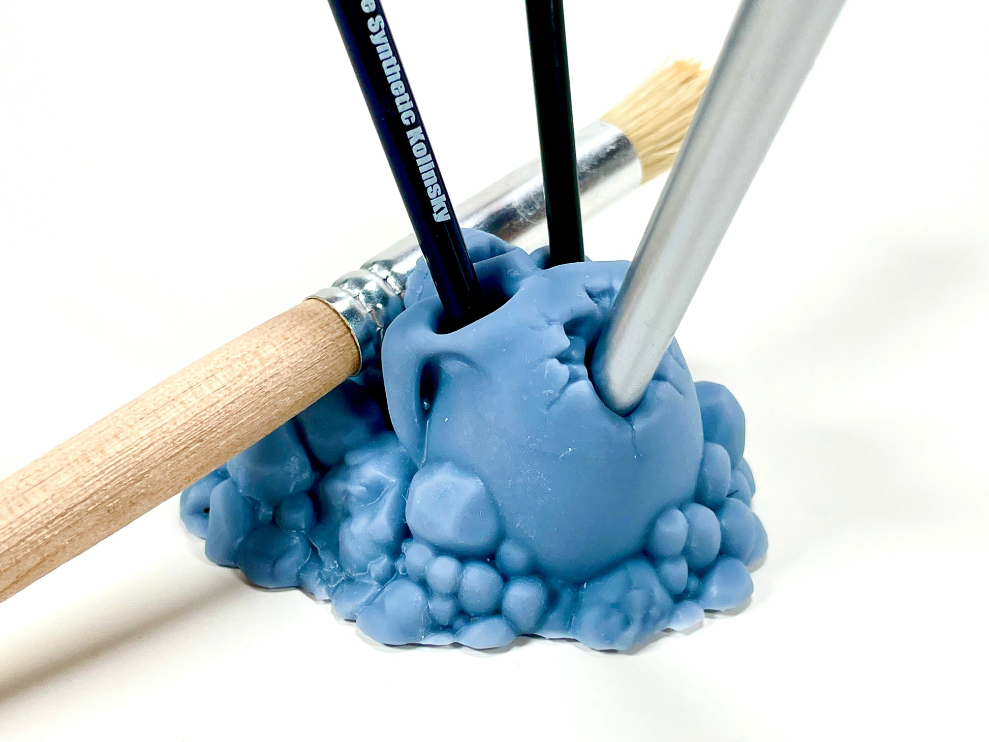 That’s where the Brush Buddy comes in! It’s small (55 × 64 mm), so it doesn’t take up much space, but it can hold up to three brushes vertically to keep them out of the way, and one can rest across the open mouth. The tapered holes fit anything from thin detail brushes to chunky base-coaters.