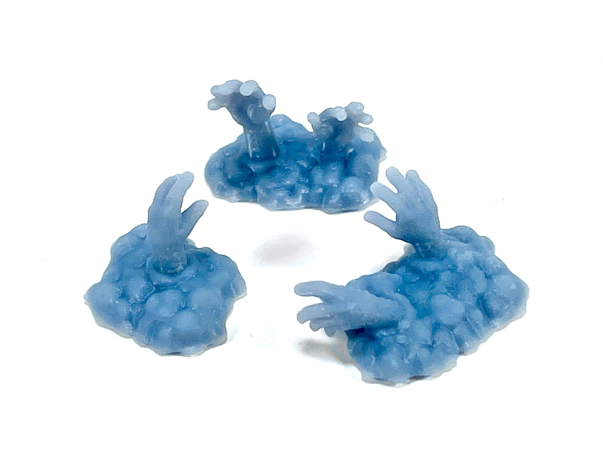 The set includes four classic, cracked, and weathered gravestones, plus three dirt mounds with zombie hands clawing their way out. Use them separately or combine them in your graveyard scenes, ruined chapel yards, or just pop them down for a nice surprise as your party wanders through a foggy forest.
