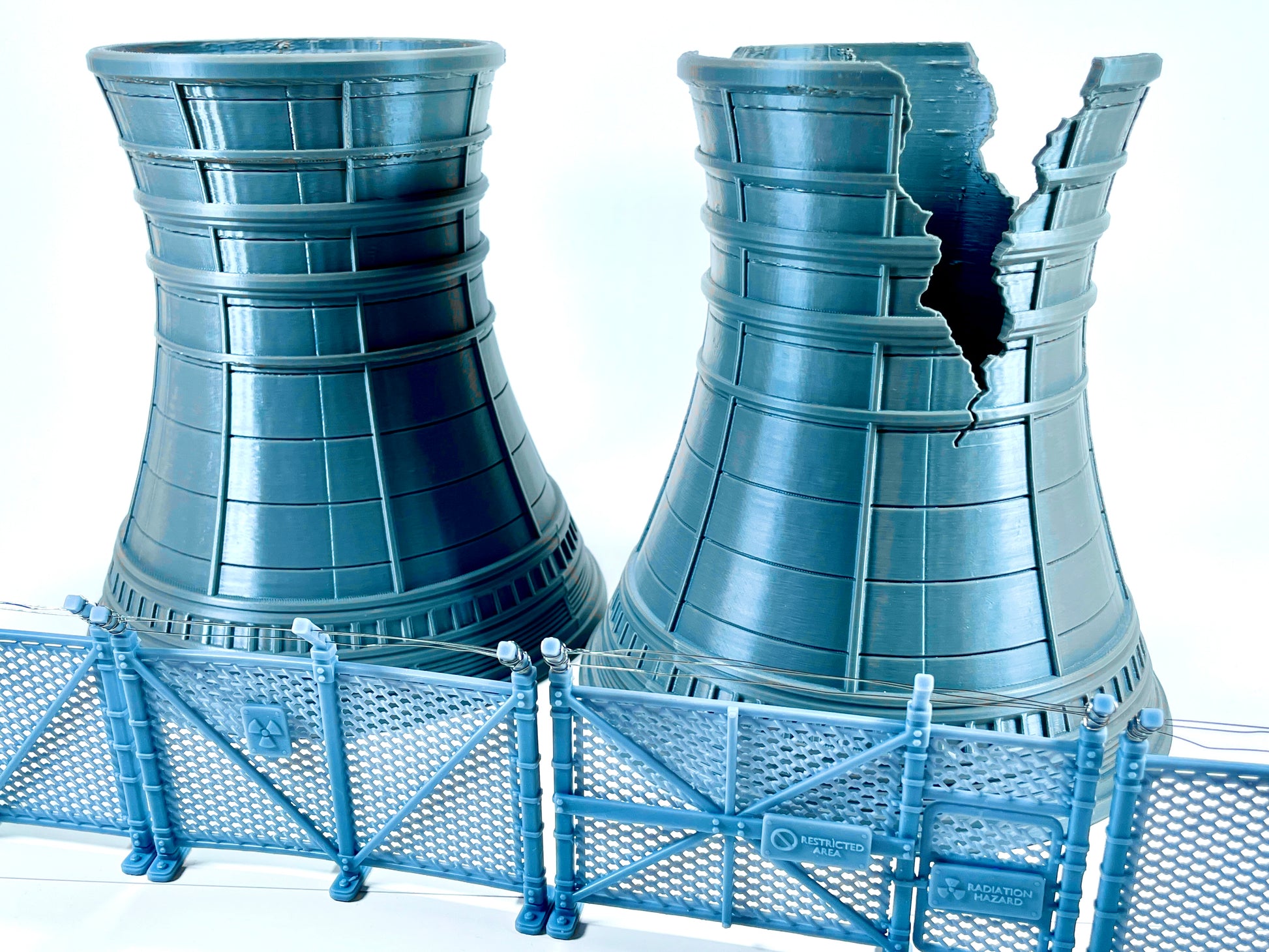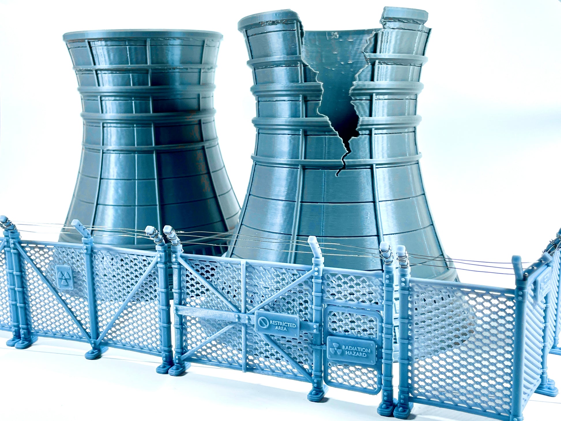 Nuclear Cooling Towers: Wouldn’t be much of a nuclear facility without some cooling towers, now would it? These pieces convey the setting in an instant! The FDM-printable version is about 7.5 inches at the base and nearly 8 inches tall, perfect centerpieces for your next power plant board or objective. The resin version is scaled to 60% for smaller build volumes and easier placement/painting. We made damaged and non-damaged versions so you can mix and match, either standard containment or catastrophic breach!