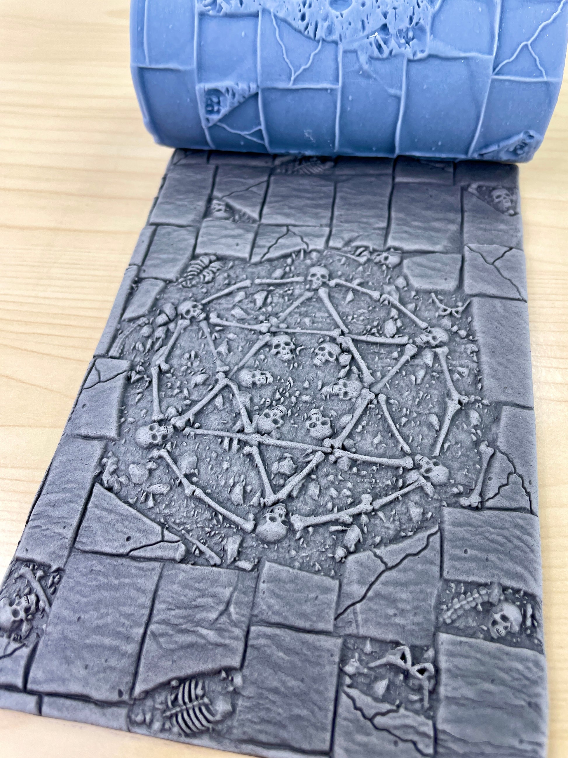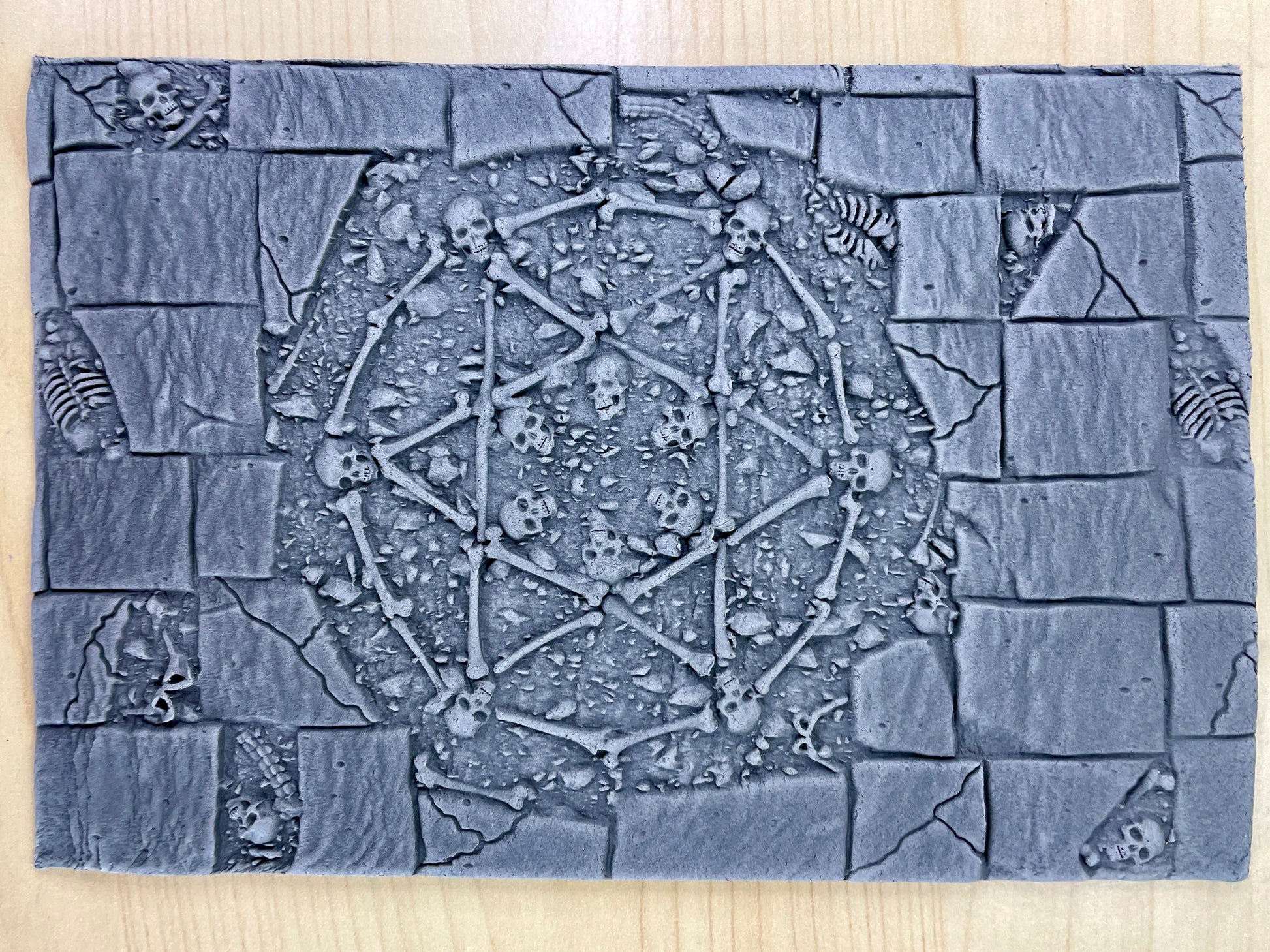 Circle Of Bones: This roller rolls out broken tiles scattered with bones and an area where the tiles have been removed to make way for a magic circle crafted from bone. This roller should make some really good bases for any dungeon or undead army.