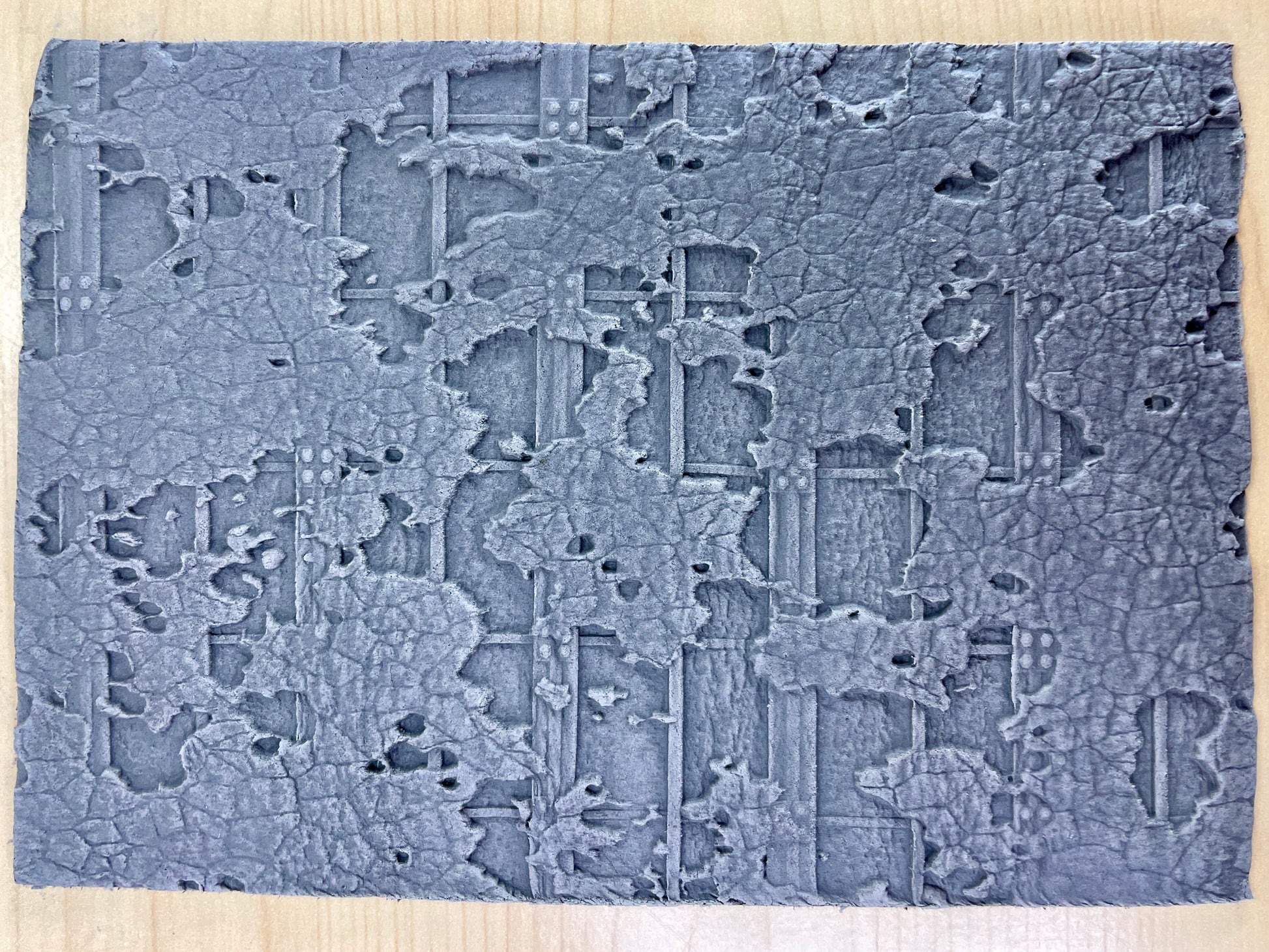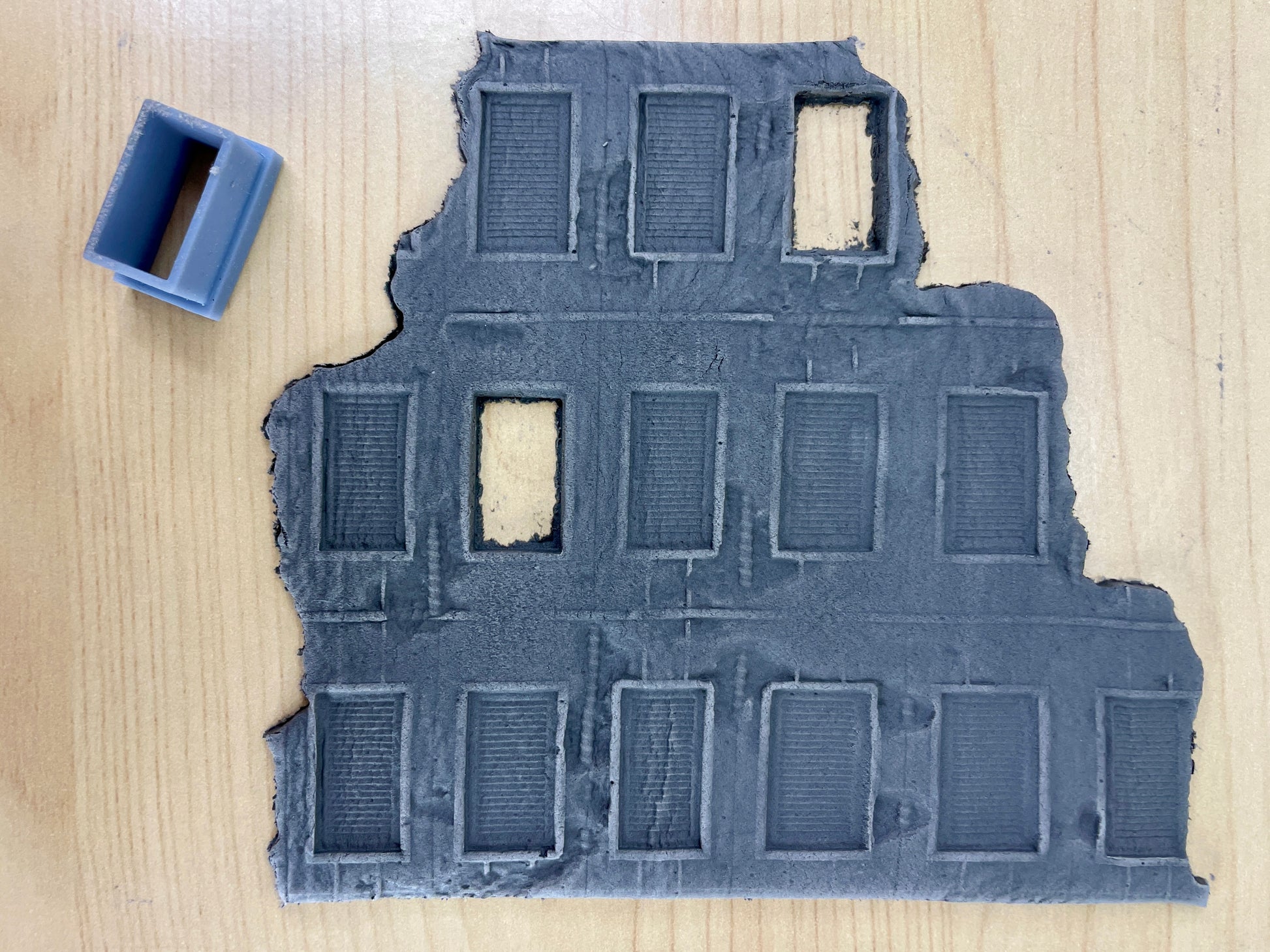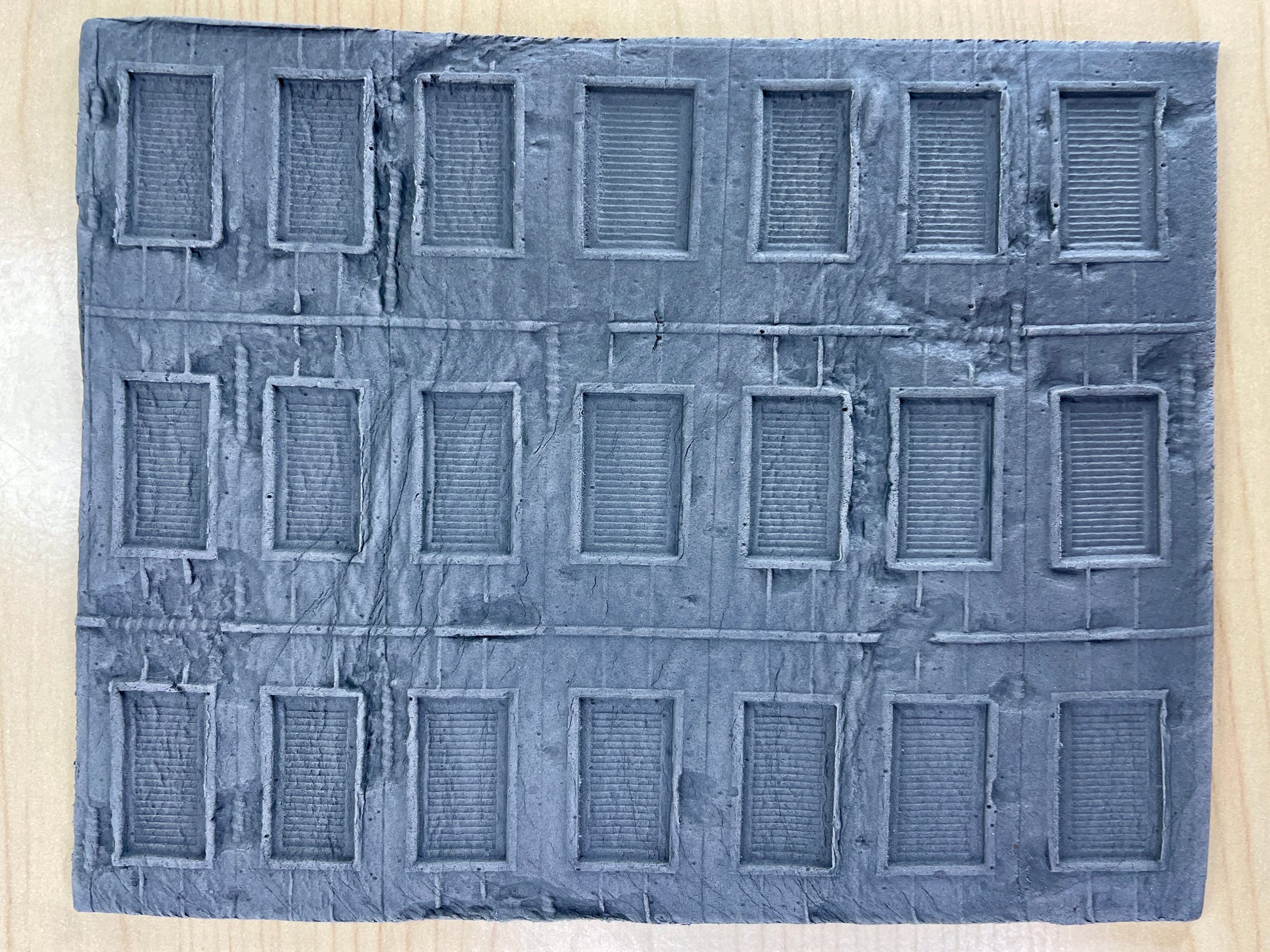 This roller is made to work alongside the 'Crumbling Concrete Wall' roller to make ruins. It contains a design made of concrete crumbling around windows with metal shutters, to depict the housing or offices of the fallen city. There are damage cutters included in the set made to cut between the windows for ruin making.