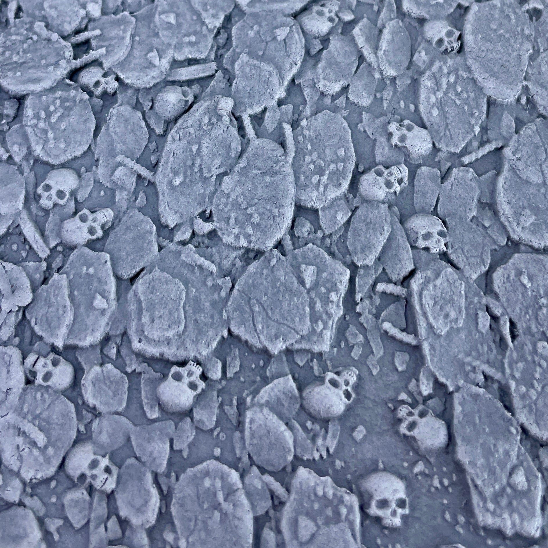 This is the perfect roller for making bases and base toppers. It features a mix of rubble caused by the collapse of the surrounding buildings, and the skulls of the past inhabitants of the city litter it. Every crack and crevice is filled with the skulls of the fallen, giving you many places to cut a base, providing you with the full range of materials and skulls for each base.
