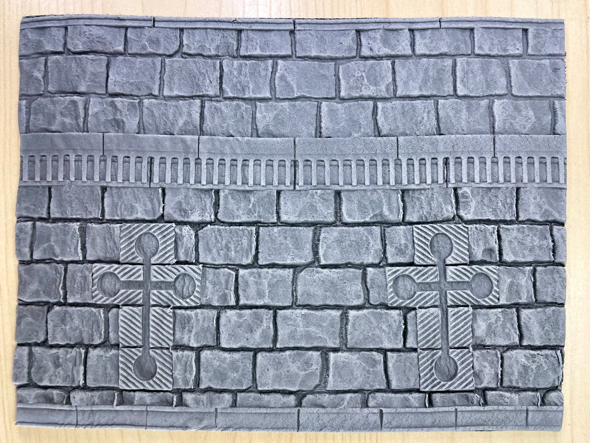 This is a roller and cutter set where the roller lays out the top of the castle wall, and the cutter then makes the cuts exactly where you need the battlements to be placed. Having it work like this makes things like making the battlements at the top of towers much easier. The roller also has some arrow slits on the lower part of the wall.