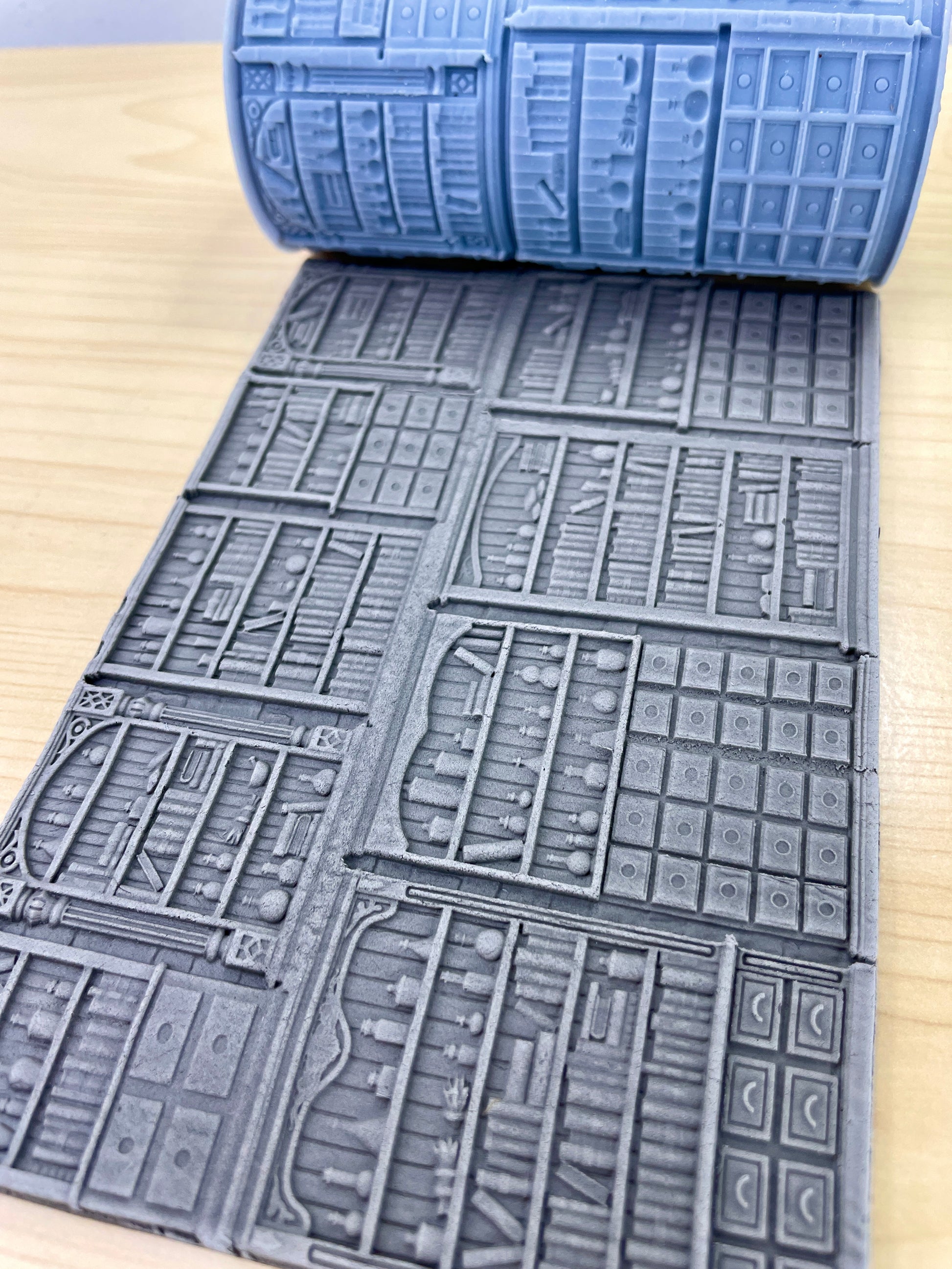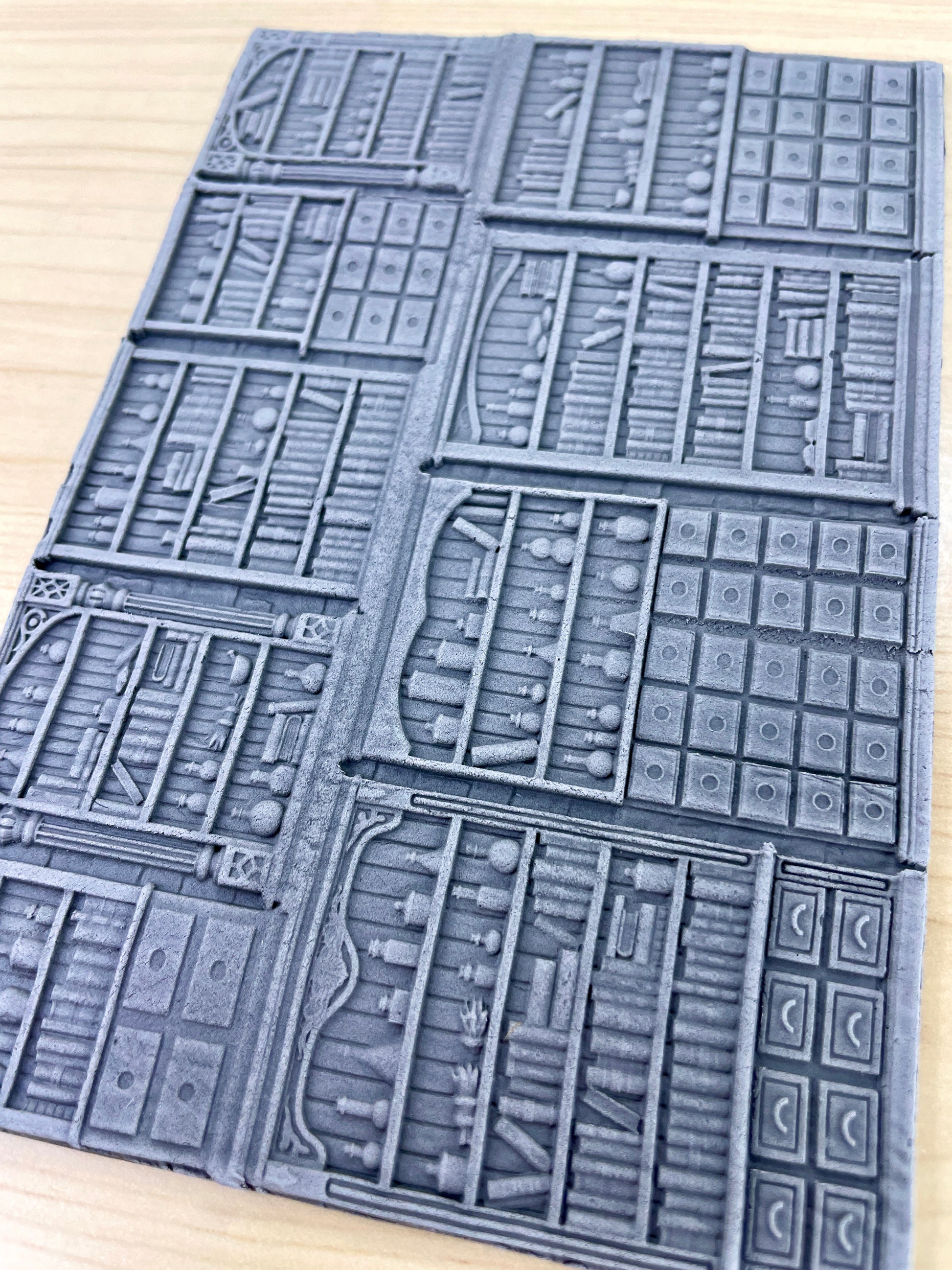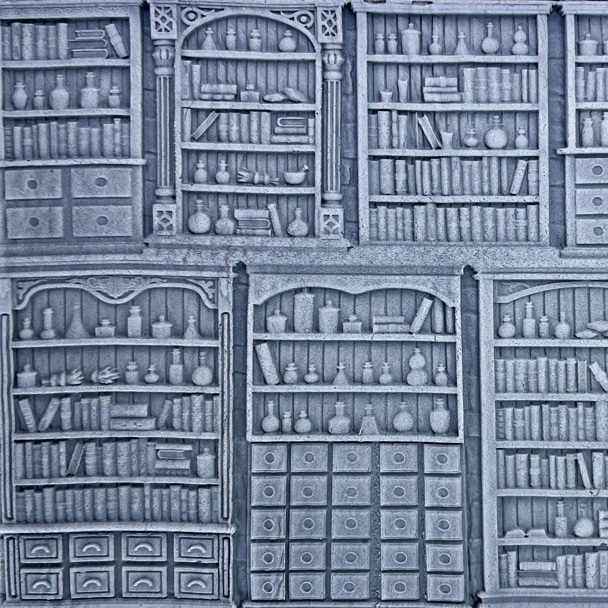 Shelves of Tomes and Potions: This roller shows how cluttered and disorganised the magic store is, with potions, tomes, and components spread between shelves and draws stacked to the ceiling in marvelous units. You can use this roller in several ways; it makes a large wall of oddities, or you can cut it to make a shorter wall of units, or even cut out the individual units to serve as facades of units on walls. - Magic Shop Panel Wall: This roller is the detailed wall roller for the set and has wooden panels with a magical theme on a brick/stone wall with ornate magical masonry. It should work for making some pretty interesting walls for any magical-themed set you make.