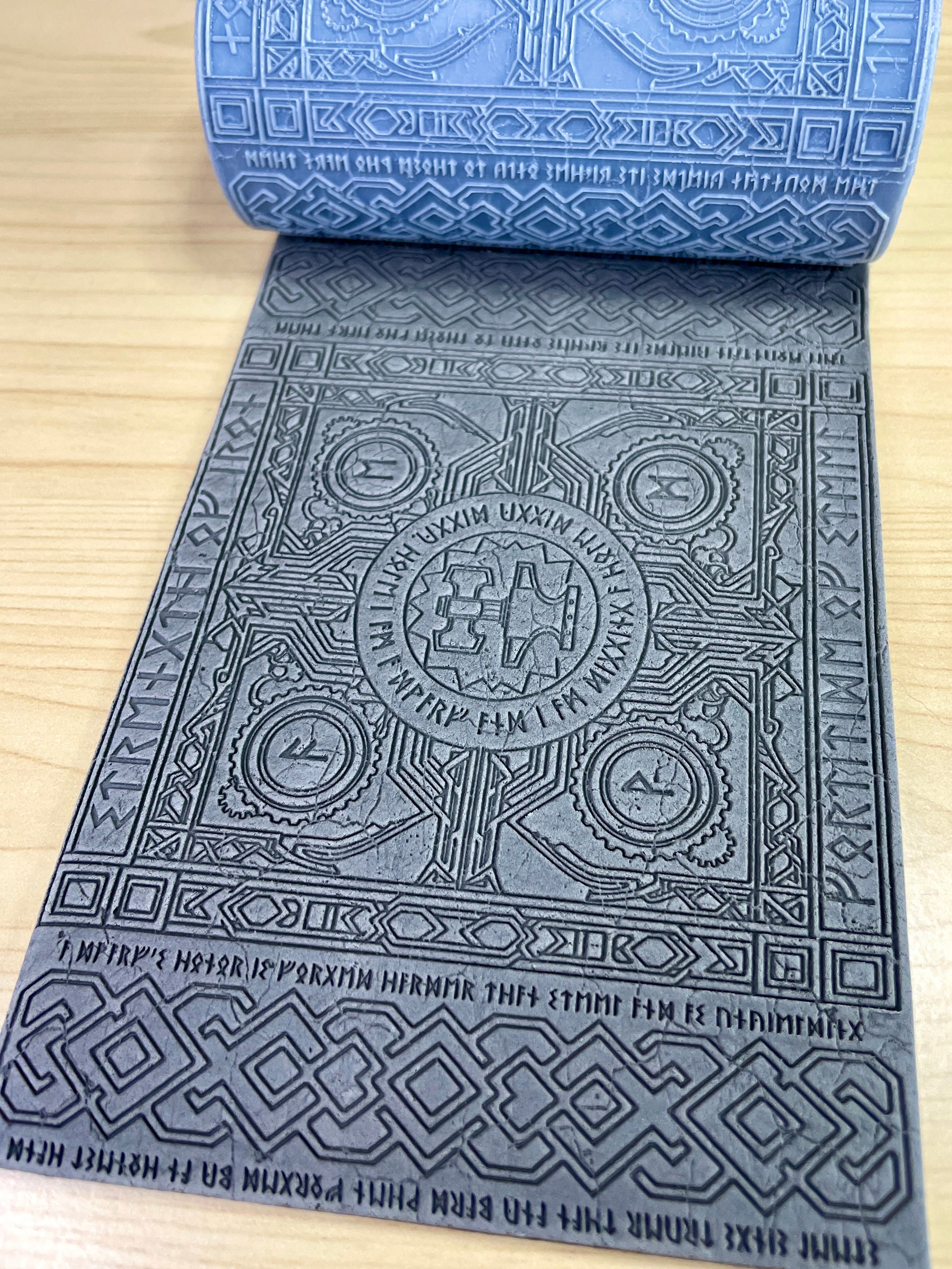 Songs of the Mountain: This is an extremely intricate dwarven design carved into the stone of the mountain, recounting words of songs that once filled the ancient halls. This roller will make very detailed bases with a lot of variety in design, depending on where you cut. It could also be used in all sorts of designs and pottery you wish to make!